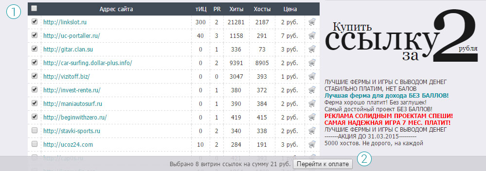 Для покупки на нескольких витринах необходимо отметить нужные галочками. Если вы хотите отметить сразу все витрины на странице, нажмите на общий чекбокс (цифра 1 на скриншоте). Он так же отвечает за инвертирование выбора: при клике все отмеченные галочки снимаются, а неотмеченные устанавливаются. Как только вы отметите хотябы одну галочку, внизу страницы появится полупрозрачный бар (цифра 2 на скриншоте) с информацией о количестве отмеченных позиций, общей стоимости покупки и кнопкой «Перейти к покупке». При переключении страниц все выделенные витрины сохраняются и вы в любой момент можете добавить или исключить любую витрину из списка.